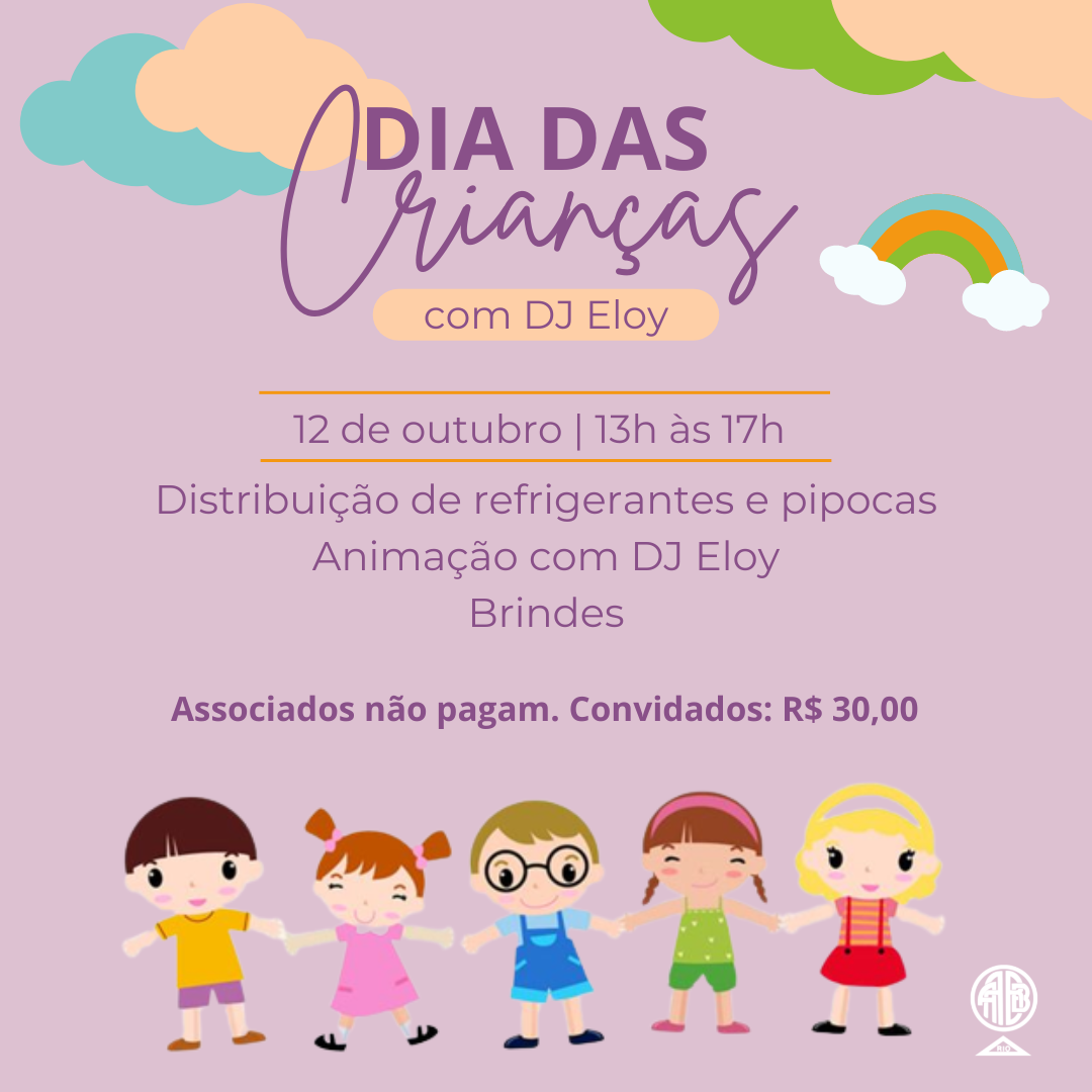 Na quarta-feira, 12 de outubro, teremos o evento do Dia das Crianças na AABB-Rio. O dia contará com brincadeiras, prêmios e animação do DJ Eloy e para completar a festa teremos, distribuição de refrigerantes para todos os associados e convidados e pipocas para a criançada.
